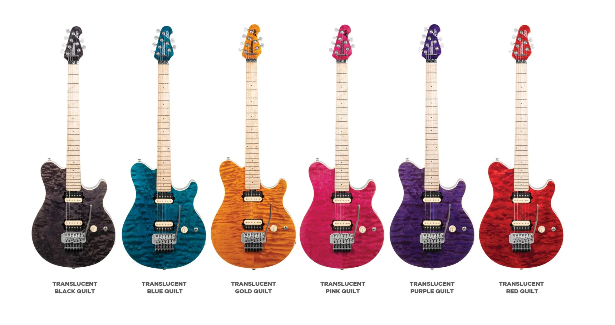 Introducing the 30th Anniversary Axis guitar. To mark 30 years of the Axis, we’re revisiting the translucent finishes that defined its 1996 debut—Translucent Gold, Black, Pink, Red, Blue, and Purple—applied to hand-stained quilt maple tops and paired with black, lightly sparkled backs that subtly echo each color. Each guitar features a figured maple neck with stainless steel frets, glow-in-the-dark side dots, the original asymmetrical neck carve, and the sought-after DiMarzio® custom-wound pickups that helped define the Axis feel and sound. Finished with a color-matched headstock face, a 30th Anniversary Axis logo on the back, and limited to 90 Gold, 60 Black, Pink, and Purple, and 30 Blue and Red instruments worldwide, every guitar ships with a certificate of authenticity and a deluxe Music Man® hardshell case.  The 30th Anniversary Axis Guitar will be available this spring.